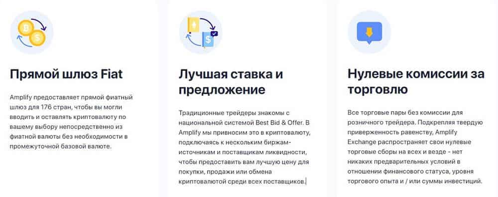 Grâce à une passerelle fiat directe sur Amplify, les résidents de plus de 170 pays peuvent échanger directement des crypto-monnaies contre des fiats avec retrait sur leur carte bancaire. L’échange a lieu lors du processus de vente de crypto-monnaies contre de la monnaie fiduciaire. De même, l’achat de crypto-monnaies en USD, GBR, EUR est disponible sur la plateforme sans intermédiaires et ressources tierces.