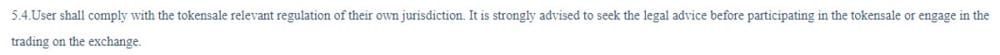 L’utilisateur doit se conformer aux règles de vente de jetons dans sa juridiction. Il est fortement recommandé de consulter un avocat avant de participer à des ventes de jetons ou de négocier sur la bourse.