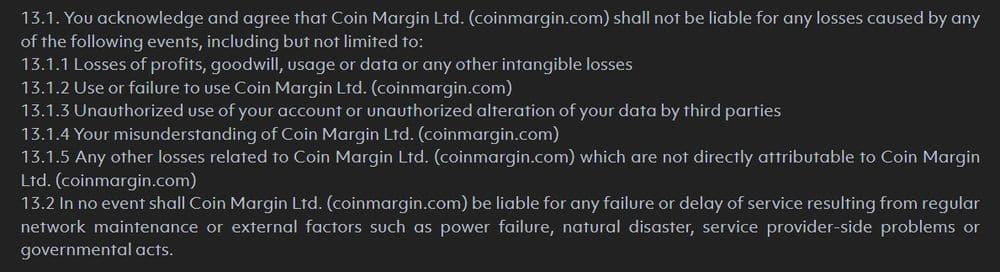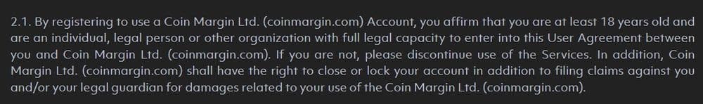 Seuls les citoyens adultes, légalement capables, d’un pays sans restrictions sur le trading de crypto-monnaies peuvent devenir un utilisateur de la plateforme coinmargin.com. Si l’administration du service détecte une inscription non autorisée, elle se réserve le droit de bloquer le compte et d’engager une action en justice contre l’utilisateur.