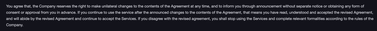 Le « contrat d’utilisation » est un document qui contient des informations de base sur la coopération avec le projet, ainsi que les obligations des organisateurs et des clients. L’accord doit être lu par chaque utilisateur avant de commencer l’enregistrement. Examinons plus en détail certains points du document. Le document indique que la société se réserve le droit d’apporter des modifications unilatérales au contenu de l’accord à tout moment et de notifier les utilisateurs des changements par annonce sans notification séparée ni aucune forme de consentement ou d’approbation préalable du client. Si l’opérateur continue à utiliser le service après l’annonce des modifications du contenu de l’accord, cela signifie que l’opérateur a lu, compris et accepté l’accord révisé et qu’il se conformera à l’accord révisé et continuera à accepter le service. Si le client n’est pas d’accord avec l’accord révisé, il doit cesser d’utiliser le service et se conformer aux formalités pertinentes selon les règles de l’entreprise.