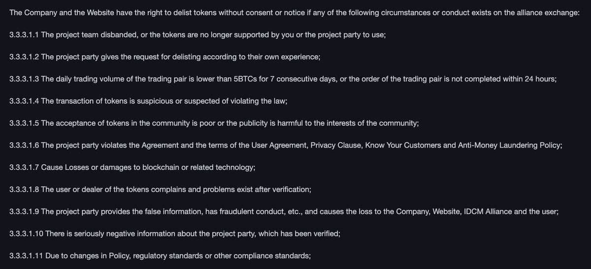 La société et le site web ont le droit d’exclure des jetons sans consentement ni préavis si l’une des circonstances suivantes existe sur la bourse de l’alliance :